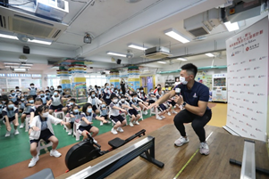香港賽艇運動員趙顯臻划入校園, 與小學生進行「 陸上 賽艇大激鬥 」