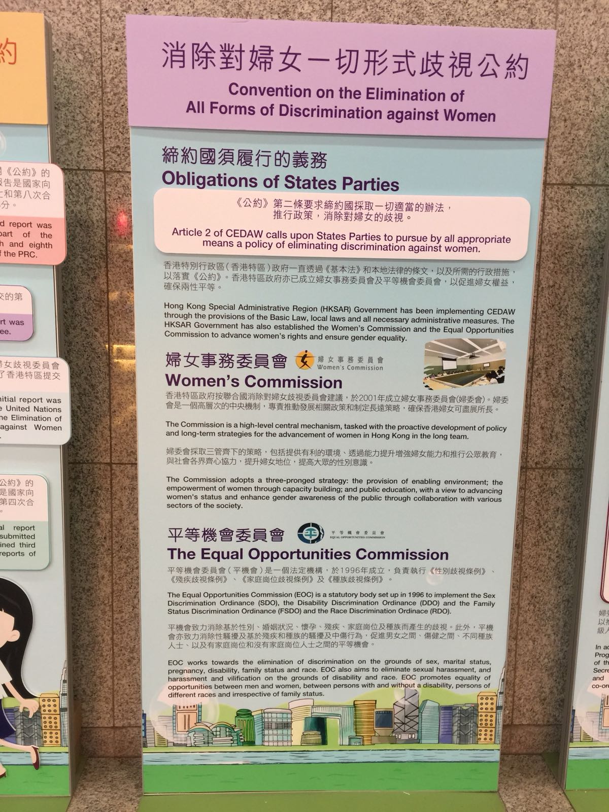 為了推廣《消除對婦女一切形式歧視公約》,特設一系列小冊子及展覽予市民參閱,在港九新界不同公眾埸地展示,更有視像遊戲作公眾教育